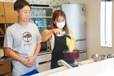事前にご自宅で1時間以上水につけいてもらったパスタと、1つのお鍋で同時調理ができるポリ袋を活用した減災時短レシピを参考にテキパキとすすめていきます。小さいお子さんも一緒にお手伝い♪