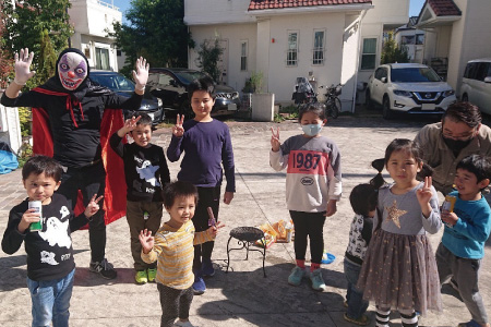子どもたちは元気よく「トリックオアトリート!」で、オバケからお菓子をプレゼント。