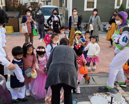 続いて、子ども達が分譲地内にくり出します。事前に準備してある住民のお宅前で「トリックオアトリート!」英語の先生と触れ合いながらお菓子をたくさんもらって喜ぶ子どもたち。最後はラッキードロー抽選会で大盛り上がり!ネイティブな先生たちと英語での交流もあり賑やかなイベントとなりました。