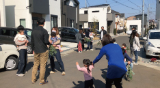 「はじめまして。我が家は三人家族です。一歳になる娘です。」雛飾りを背景にお子様を紹介下さるご家族。お名前、ご家族紹介、分譲地のみなさんへのひとことなどみなさんでご挨拶をしていただきました。