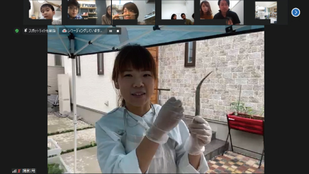 野菜にまつわる○×クイズで楽しく学んだあとは、オクラの種取り体験です。農家さんによるデモンストレーションを交えながらのレクチャー。採れたての種は参加者からひと家族代表いただき、農家さんと一緒に菜園スペースへ種まき、水やりまでをオンライン中継。参加の皆さんからは育て方などのいくつも質問がみられ、関心の高さと、楽しみにされている様子がうかがえました。