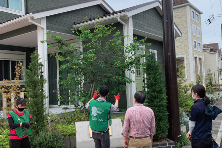 こちらの分譲地では、住民の皆さんでまちなみ景観を維持していくため、管理組合が主導し植栽業者さんによる定期的な植栽剪定と講習会を開催。今回がその第1回目となります。