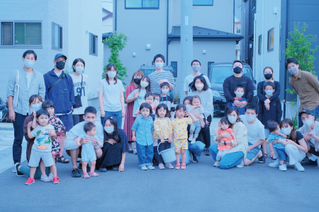 当日は一度集まって集合写真をパシャリ。その後あらかじめ分けておいた花火を全世帯に配布しそれぞれ楽しんで自由解散という流れに。子ども同士花火を楽しみ、大人達も和気藹々と話され、初めてお話しする方もいらっしゃったりと交流を深めました。