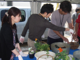 青空の下、季節の寄せ植えワークショップを開催。テーマは「サラダバスケット」。その名のとおり使用する植物はルッコラやタイム、ワイルドストロベリーなど全て食べられるものです。