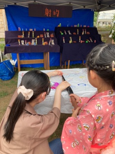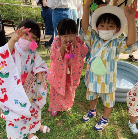 子どもたちは受付でチケットをもらい、お楽しみ出店プースへ。ヨーヨーや射的などのゲームを楽しんだり、フワフワのわたあめや、冷たいかき氷をお友達みんなで食べながらにっこりポーズで写真撮影。たくさんの夏の思い出ができました。