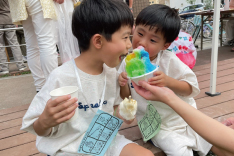 子どもたちは受付でチケットをもらい、お楽しみ出店プースへ。ヨーヨーや射的などのゲームを楽しんだり、フワフワのわたあめや、冷たいかき氷をお友達みんなで食べながらにっこりポーズで写真撮影。たくさんの夏の思い出ができました。