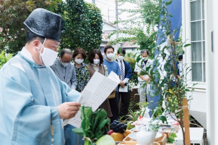 当日は生憎の天気でしたが、式典を祝うかのように上がった晴れ間、施主様ご家族が参列され、ご縁のあった駒木諏訪神社様によりお祓いいただきました。