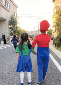お菓子配りをしてくれたパパが"かおなし"の仮装をしていたので少し怖がって静止してた子も居ましたが、1人1人お菓子を貰うことが出来ました。