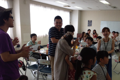 2チームに分かれて自己紹介タイム。チーム代表の方がみなさんのご家族の他己紹介をしました。サッカーが趣味のパパさんも多く、サッカーチームができそうです。子どもたちもみんな仲良し。お姉さんのあとをついてまわって大はしゃぎでした。