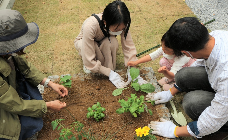 ビー・グレイス梅郷 紡ぎの街は、各戸に家庭菜園スペース「ポタジェ」が設けられてあります。今回、みなさんの交流の機会と野菜の苗を植えていただくワークショップを企画・開催しました。