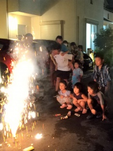 パパさんが作ってくれた冷たいかき氷を食べてクールダウン☆ヨーヨー釣り、射的、水風船・水鉄砲と盛りだくさんのコーナーを楽しむ子どもたち。大人たちは、なかなか会う機会がない人たちとも会えて近況報告をしあい、交流を深める機会となりました。クライマックスの花火を満喫し、たくさんの夏の思い出ができました。