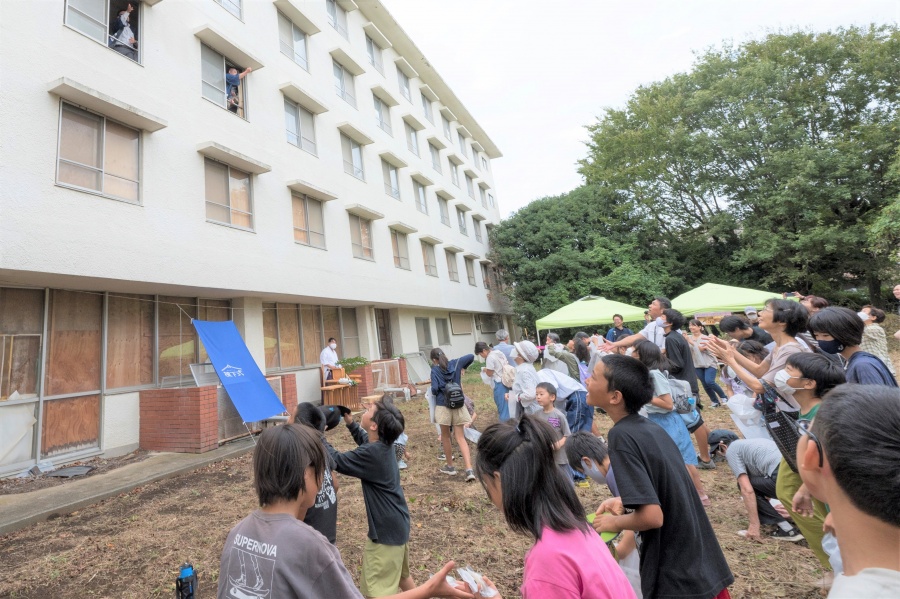 厳かな雰囲気の中で清祓いが執り行われた後には餅まきが行われ、大人も子どもも撒かれるお餅に笑顔で手を伸ばし、お子様にはお菓子が配られ、引き継がれるこの場所の未来を賑やかに祝いました。