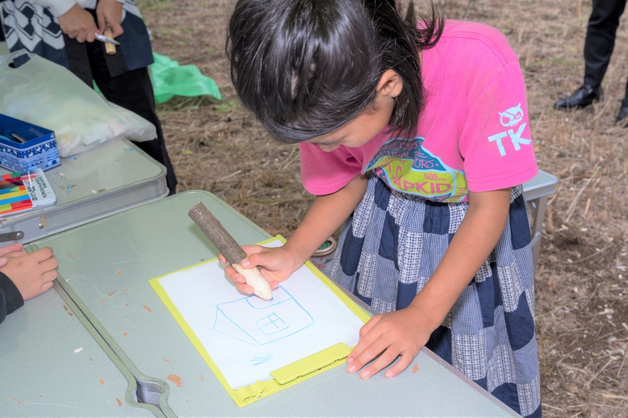 最後は庭園内の木の枝をリメイクして色鉛筆づくりを。子どもたちがわいわいと枝を削り、カラフルでかわいらしい色鉛筆に変身しました。いつまでも思い出として手元に残していただけたら嬉しく思います。