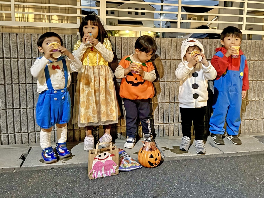 子どもたちは思い思いの仮装をして大はしゃぎ!お菓子パーティーで盛り上がって、お腹いっぱい食べていました。大人たちも写真を撮ったり、お喋りしたりと楽しい時間を過ごせました。