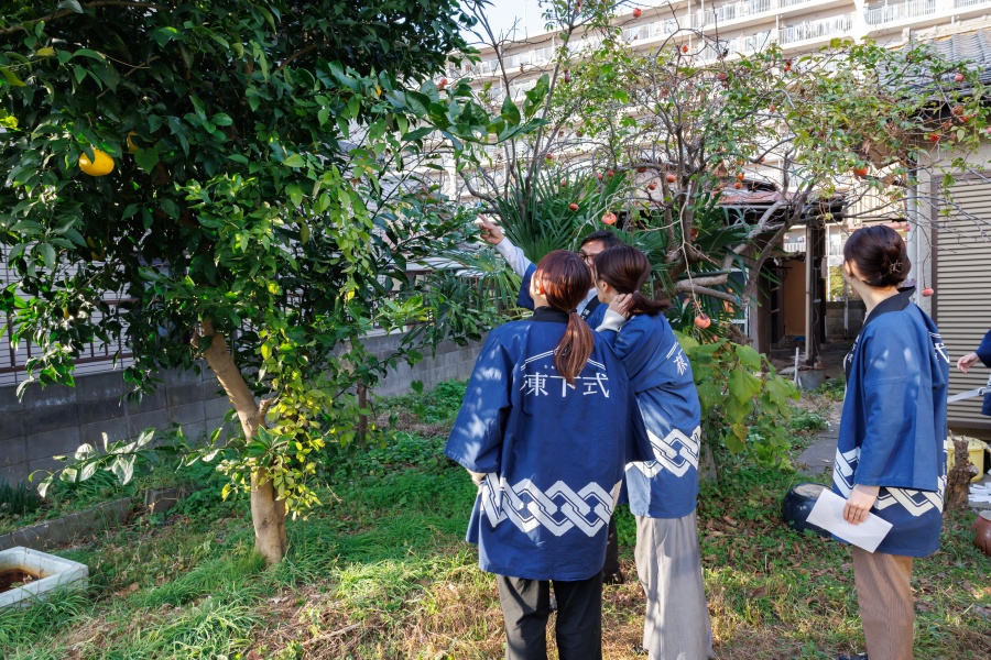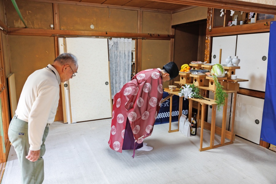 棟下式当日は、式典を祝うかのような小春日和の中、建物への感謝とお別れの時間がスタート。氏子総代も務められている施主様のご自宅にはお稲荷様や榊の木が配されており、今回の清払いでは庭の榊を使わせていただきました。