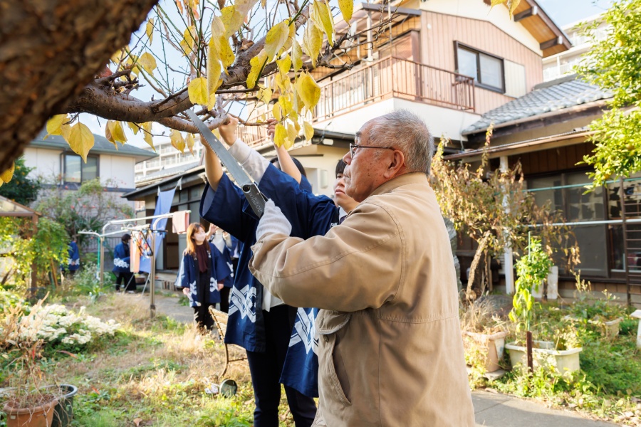 お庭の黄金ヒバの木は、ご結婚の際に浦和市(当時)からお祝いとして贈られたものというエピソードも。その他にも、実がたわわになる柿の木や、柚子や夏みかんなどがたくさん植わっています。その中から特に思い出深い木の枝を、お施主様に切り出していただきます。思い出の継承として庭木の枝は色鉛筆にリメイクされ、後日お施主様のお手元に残る予定です。