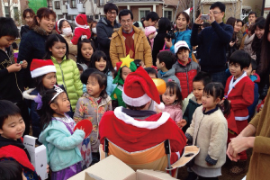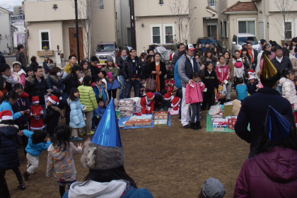 サンタさんが登場。子ども達一人一人にお菓子のプレゼント。本物のサンタさんと喜んでいる子ども達が沢山いたそうです。もちろんサンタさんも住民のパパさんです。
