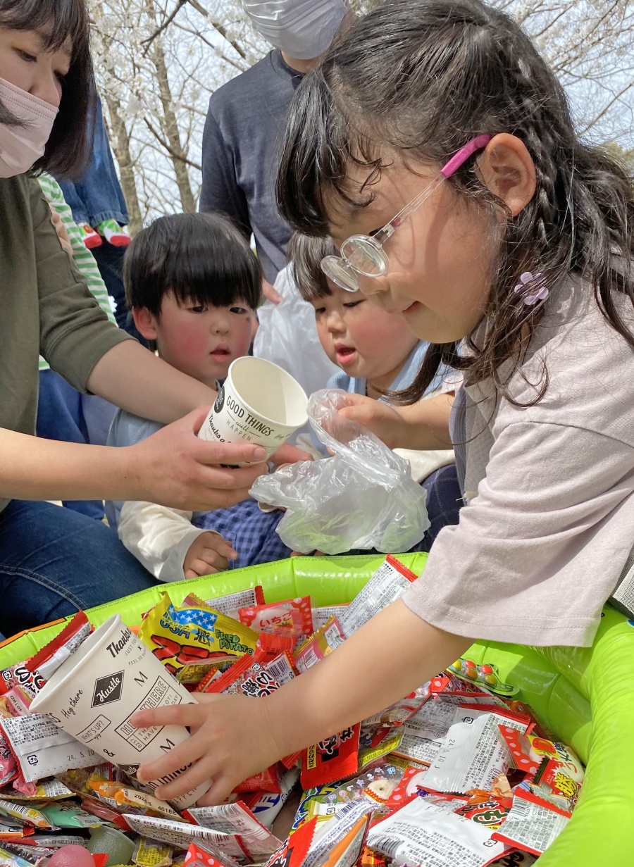 走り回ったり、桜と写真を撮ったり、ラジコンや風船で楽しそうに遊ぶ子ども達。大人達は普段お話する機会がない方同士で話をしたり、子ども達と一緒に遊んだりしながら思い思いに過ごした後は、お菓子をコップですくうゲームを開始。子どもも大人も真剣!子ども達はお菓子をすくった後に、ママやパパに「こんなにいっぱい取れたよー」と報告。パパママも同じように我が子に報告をしていました。