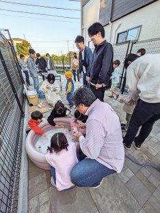 焼きたてのフランクフルト&ラムネに舌鼓をして、スーパーボールすくいを楽しむ子どもたち。日が暮れ始めた頃にみんなで手持ち花火を満喫して、大人も子どもも楽しみながら交流も深まった一日となりました。