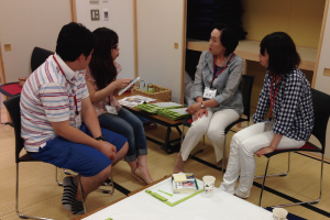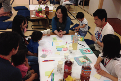 まずは、ご家族同士ペアになって他己紹介タイム。家族構成や、休日の過ごし方、カフェマチ新座を選んだ理由など情報交換をしました。新居でのお気に入りポイントではの質問では、「オートシャッターがGood!」「自分の庭が持ててうれしい♪」「書斎がとっても素敵」などたくさんの話で盛り上がりました。