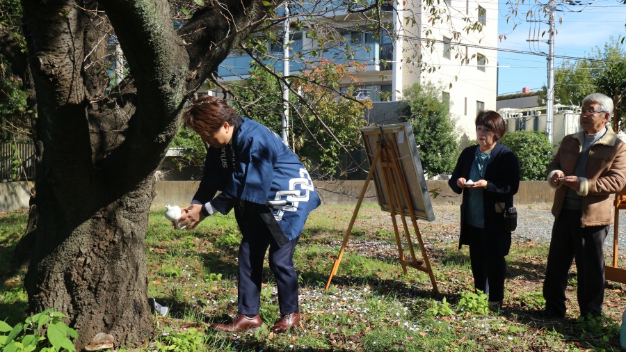 参列されたご親族のお一人は幼少の頃に、よく桜の木に登って遊んでいたとのこと。最初は高さの低い左側の木に登っていましたが、成長とともに、高さのある右側の木にも登れるようになっていたそうです。また以前は敷地内の一部に畑のスペースを設け野菜を育てており、キュウリをもいで食べたり、大根を抜いたりしたことをよく覚えていると笑顔でお話くださいました。