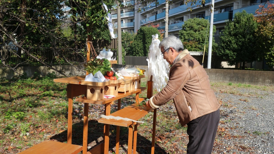 当日は、式典を祝うかのような小春日和の中、施主様ご夫婦をはじめご親族が参列され、ご縁のあった鎮守氷川神社様によりお祓いいただきました。