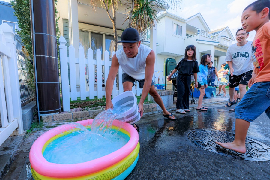 クイズで知識を競い合ったあとは、屋外に場所を移し、いよいよ分譲地対抗『バケツリレー』へ。各チーム8名が列を作り、ビニールプールを水で満たすまでの速さを競う真剣勝負です。