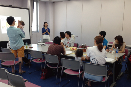 交流会では、同年代のお子様がいるパパさん、ママさん同志、早速情報交換。保育園情報、お買いものスポット情報etc ・・・