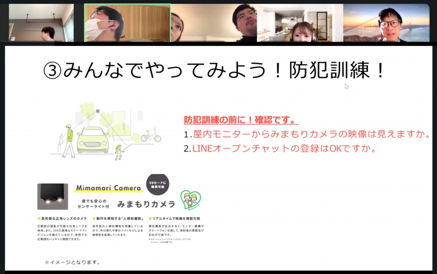 弊社分譲地プランナーによる分譲地コンセプトや設備説明の後、各ご家庭に設置されている「みまもりカメラ」を使った実践的な防犯シミュレーションを実施しました。