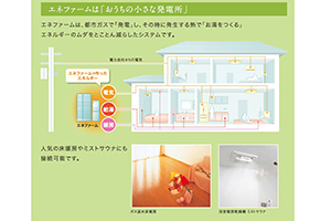 エネファームは、都市ガスで発電し、その時に発生する熱でお湯をつくるシステムで、省エネルギーや、省CO 2にもつながります。