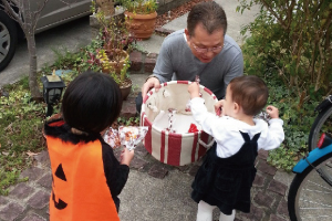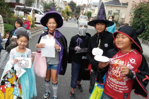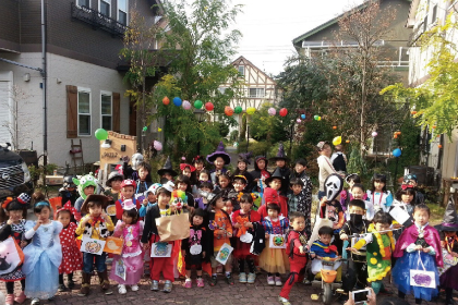 子どもたちみんなで仮装して、おやつをもらうスタンプラリー。楽しそうに分譲地内をかけまわります。小学生の高学年の子が幼児、低学年のこの様子をよく見てくれたり、とても微笑ましい光景。また今年はパパやおじいちゃん、おばあちゃんの参加も増えたようです。