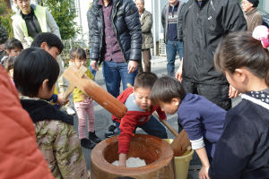 パパ達は力強く「ヨイショ!ヨイショ!」。子供たちも交代で10回ずつ「ペッタン!ペッタン!」つきあがったお餅を丸めたり、配ったり。みんな協力してくれたので早く食べることができたそうです。