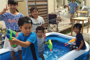 夏休み中とはいえ、普段お会いできないご家族も多いので、大勢集まってのにぎやかな雰囲気に、大人も子ども大盛り上がり♪子どもたちはプールや花火を楽しんでいたそうです。