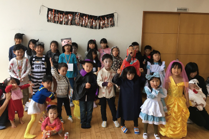 イベント当日は仮装した子どもたちが雨の中嬉しそうに会場に集合。ハロウィンにまつわるクイズ大会・じゃんけん列車・お菓子のつかみどりと大盛り上がり!!大人達は全員で「ハッピーハロウィン♪」と子どもたちにお菓子を手渡し楽しまれたそうです。