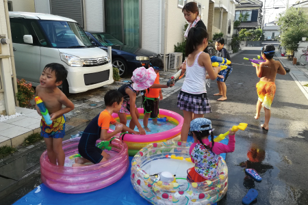 毎年恒例イベントとなっている夏のバーベキュー交流会。まずはmy水鉄砲を持ち寄った子どもたちがミニプールで大盛り上がりの水遊び!