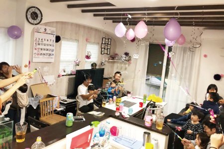パパ達はテントの下でバーベキュー。外で焼いたお肉や野菜を、ママ・子ども達に渡し、家の中で調理した焼きそばや揚げ物をパパ達に。ママと子供達は室内でのパーティーをそれぞれみんな楽しみました。