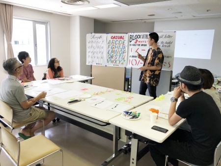 当日は、ガラスギルダー(ガラス工芸アーティスト)として活躍されている山浦紘史氏を講師にお招きし、フリーハンド(手書き風)で文字やロゴを看板や壁面などに直接描く‘サインペインティング’の方法をレクチャーいただきました。