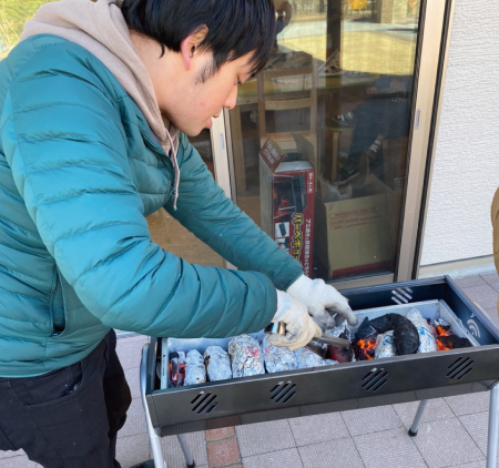 それぞれサツマイモや飲み物、おつまみを持参されお芋が焼けるのを待ちながら子どもたちは2階でワイワイ♪大人たちは飲食しながら交流を楽しまれました。3~40分ほどでホクホクの焼き芋が完成!
