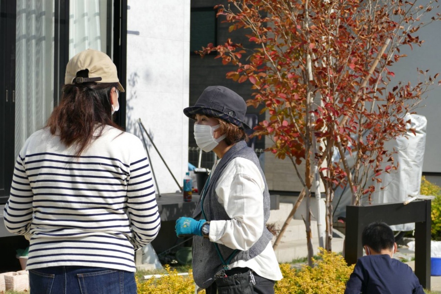 当日は一度みなさんで集合して、園芸のプロによる植栽のお手入れ&剪定のポイントなどのレクチャーを受けた後は、各ご家庭のお庭のお手入れを。プロに相談されながら、家族で一緒になって植物の手入れをしていました。また、共有スペースの花壇もみなさんで協力して手入れをされて、すっきり綺麗に♪
