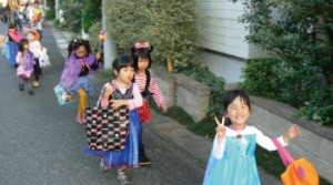 公園でお菓子を配る家庭と自宅で配る家庭に分かれ、子ども達が訪問。みんな思い思いの仮想をして、「トリック・オア・トリート」「ありがとう!」と大きな声で言っていたのが印象的でした。