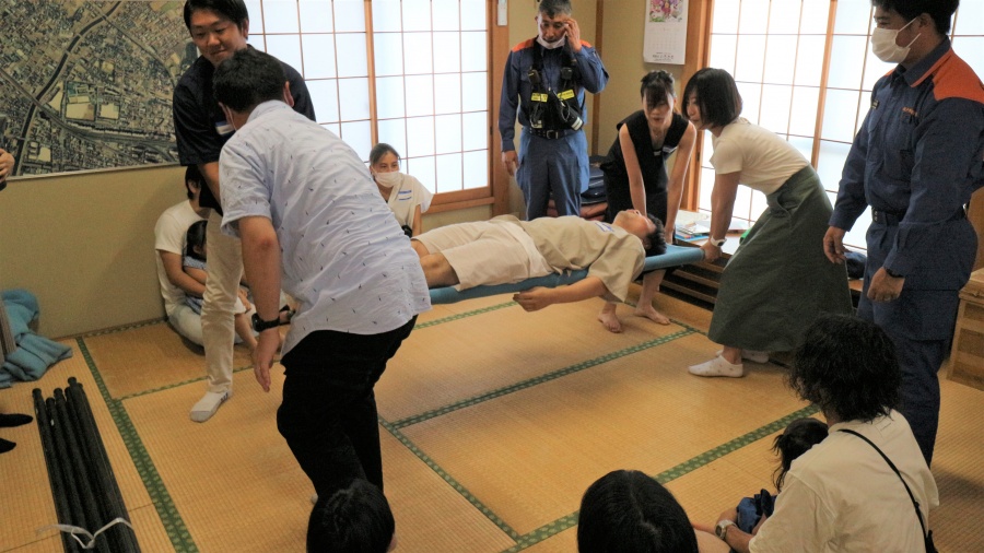防災マップや洪水ハザードマップを見ながら避難場所の確認や近隣河川の情報など、隊員からのアドバイスの後は、水消火器を使った初期消火訓練と、毛布と物干し竿を使った搬送法講習を順番に体験。楽しみながらいざという時に慌てない備えを習得いただきました。