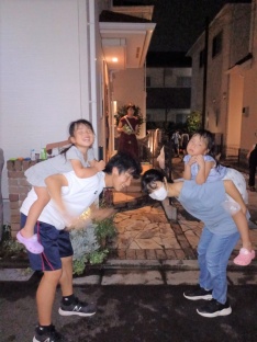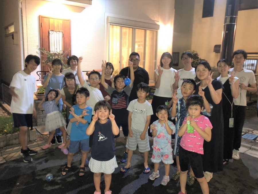 パパさんが作ってくれた冷たいかき氷を食べてクールダウン☆ヨーヨー釣り、射的、水風船・水鉄砲と盛りだくさんのコーナーを楽しむ子どもたち。大人たちは、なかなか会う機会がない人たちとも会えて近況報告をしあい、交流を深める機会となりました。クライマックスの花火を満喫し、たくさんの夏の思い出ができました。