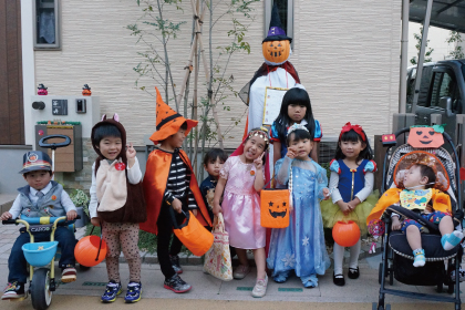 参加して下さったお宅からお菓子をもらい歩く子供たち。それぞれ仮装しての参加です。手作りしたドレスもあれば、かわいいお人形さんのようなお子さんも。子供たちはもちろん、大人も気合いの入った仮装で参加していました。