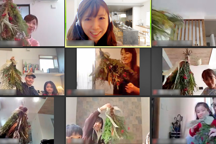 まずは、ビデオ会議ツールZoomに集まって、オンライン植栽ワークショップから。園芸のプロより、庭木の剪定のポイントや芝生の刈り込み方などをお伝えしていただいた後は、今回みなさんに挑戦していただくフレッシュな草花を使ったクリスマススワッグ作りを。