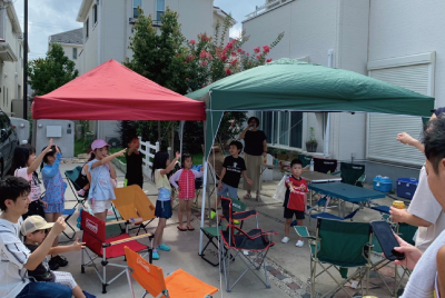 「猛暑だった為、2ルームテントをシェルター代わりに建てて、各家庭のサーキュレーター4台設置しました。それでも暑くて大変でした」
