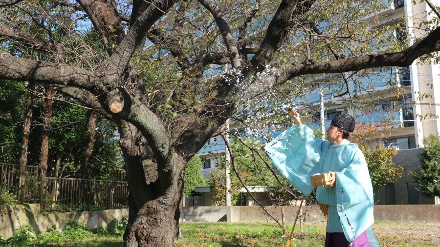 今回、ご縁があり弊社が引き継いだ土地には、立派な二本の桜の木が立っています。58年前に植えられもので、毎年春には満開の花を咲かせています。ご家族はもちろん地域の方にも愛され、思い出深い桜の木とお別れをしたいというお申し出を受け、弊社より棟下式をご提案させていただき、清祓いを執り行う運びとなったものです。