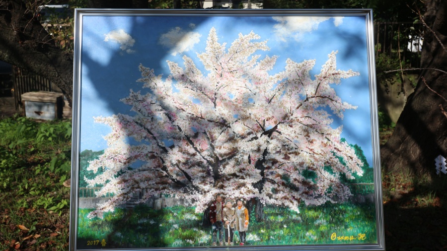 ご持参くださった油絵は、施主様ご本人により書かれたもので、桜の木をバックに、お母様、ご主人様、奥様の3人が描かれています。