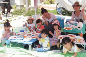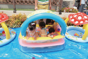今回のイベントは、新たなお子さまも増えたので、お披露目もかねての住民交流会です。BBQ場ではなく、分譲地内の駐車場で開催。みなさんで、買い出しや準備を協力して行ったそうです。当日はとても暑く、急きょプールを設置。子ども達もより仲良くなりました。