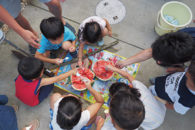 夏休み中とはいえ、普段お会いできないご家族も多いので、大勢集まってのにぎやかな雰囲気に、大人も子ども大盛り上がり♪子どもたちはプールや花火を楽しんでいたそうです。