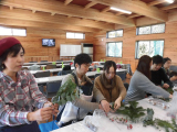 後半は、グレイスオブガーデン様を講師に迎え、みなさんでクリスマスの伝統的な壁飾り”スワッグ”を作りました。数種類のグリーンを束ねてオーナメントやリボンの配置していきます。ご家族で協力してみなさん素敵な作品が出来上がりました。